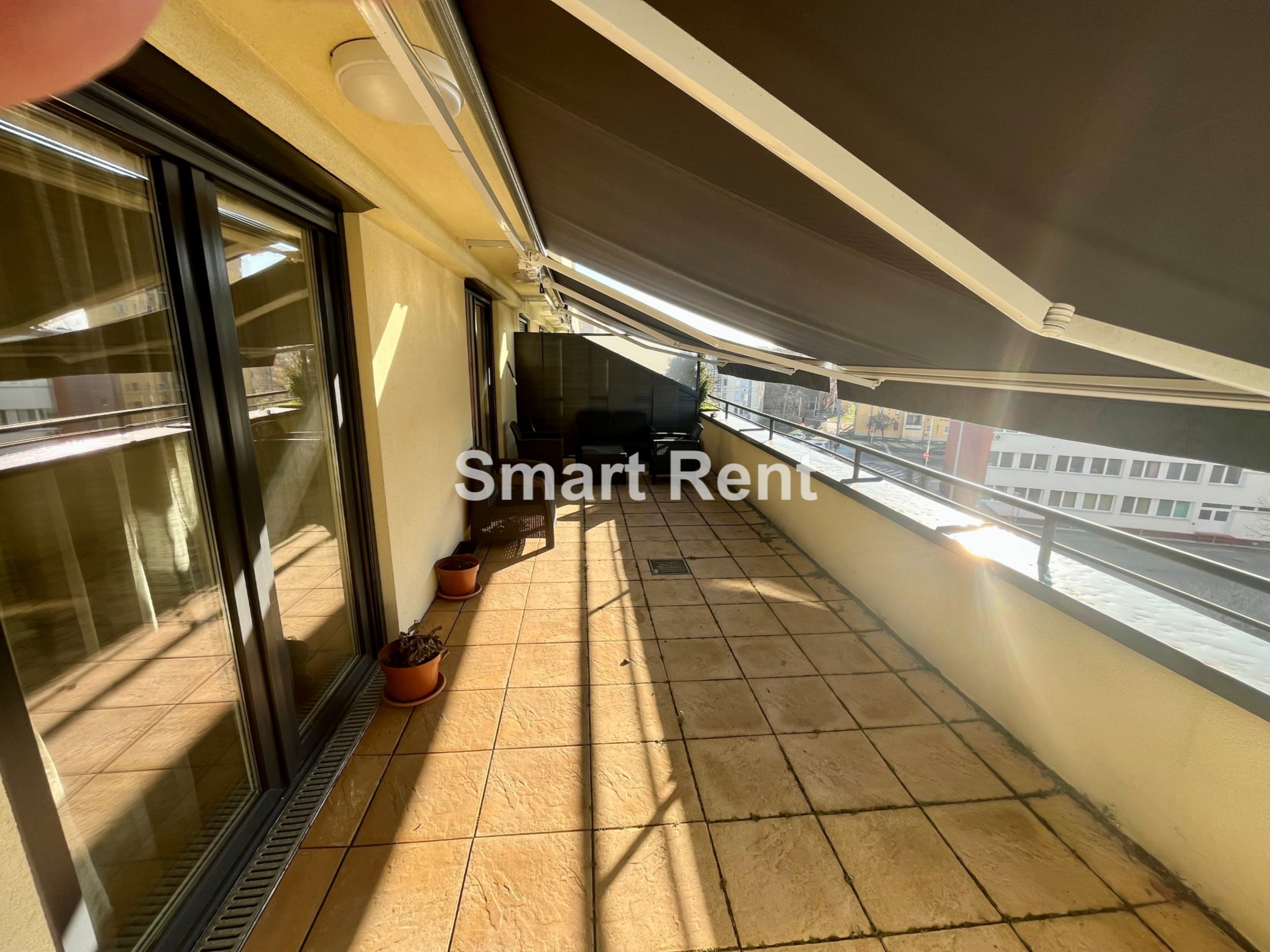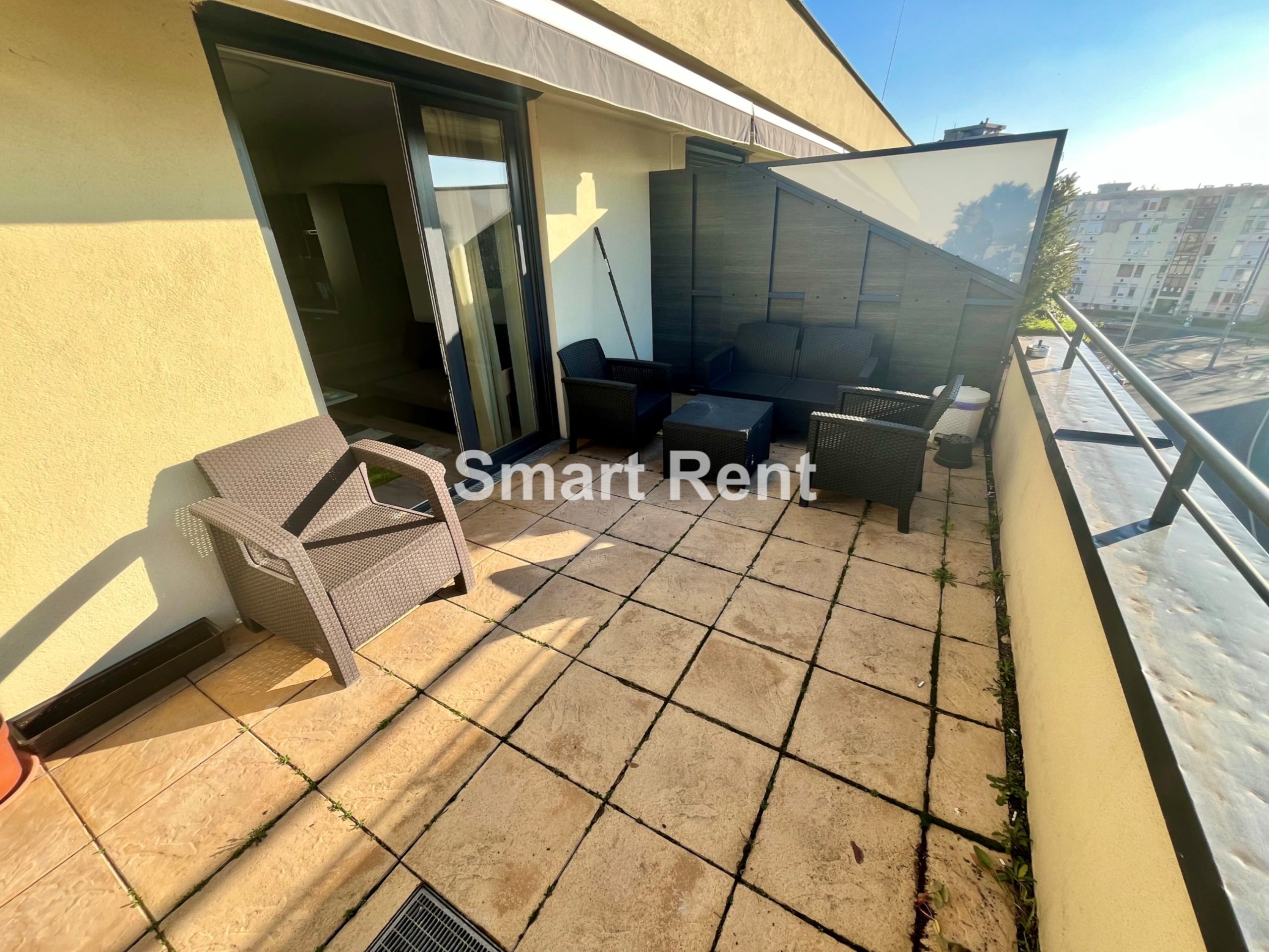A key highlight is that the living room and both bedrooms have direct access to the terrace, which is furnished with outdoor furniture and an electric sunshade.